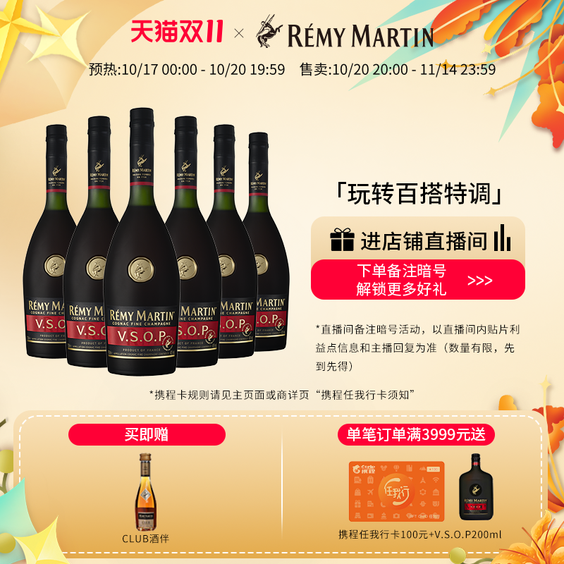 【双11抢先购】法国人头马VSOP优质香槟区干邑白兰地700ml*6洋酒