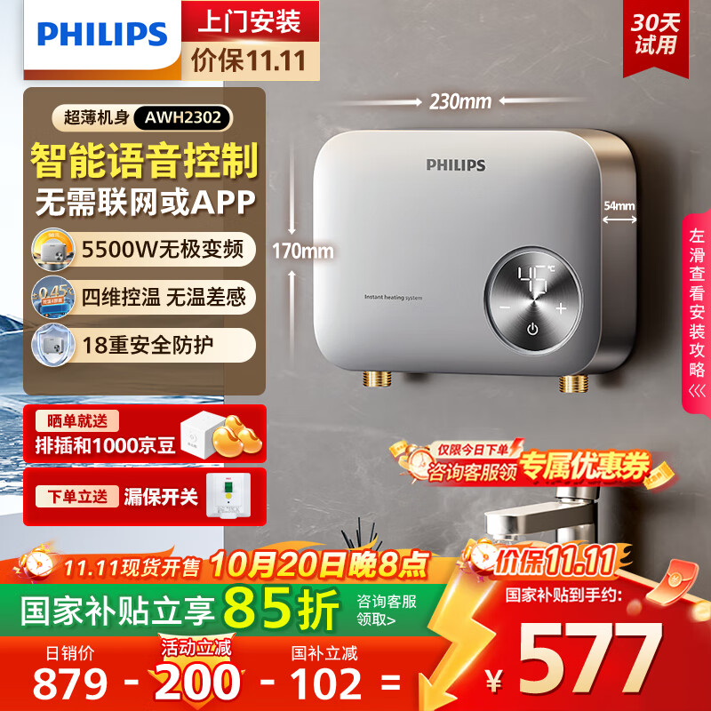 飞利浦(PHILIPS)即热式小厨宝电热水器 智能语音控制5500无极变频 国家补贴15% 免储水AWH2302/93(55DA)升级版