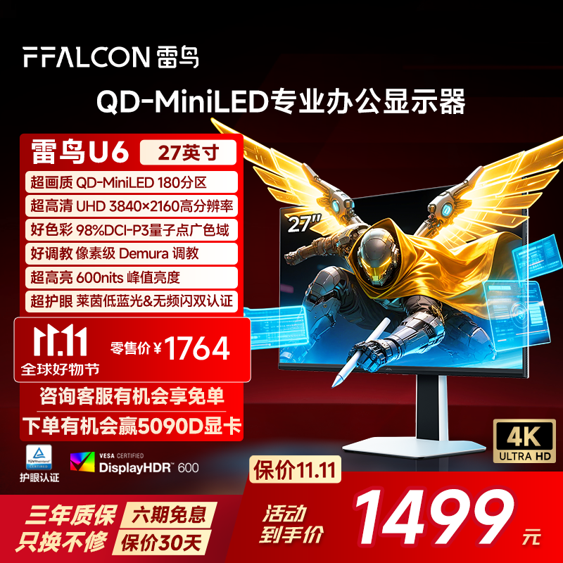雷鸟U6 27英寸4K180分区QD-MiniLED超清办公显示器 适配MAC HDR600 Type-C 65W 旋转升降护眼显示屏 雷鸟U6/27英寸直屏/4K办公