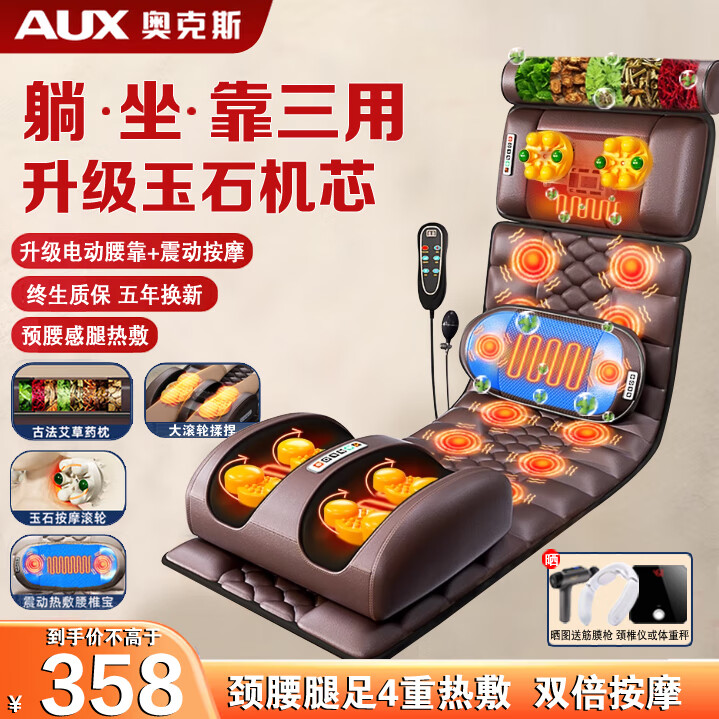 奥克斯AUX按摩垫全身躺垫按摩靠垫按摩仪颈椎按摩器多功能床垫家用按摩椅腰背颈肩生日父母情人节礼物 至尊皮革【升级玉石机芯+电动腰托+全身按摩+药枕】 情人节礼物送男女老师朋友