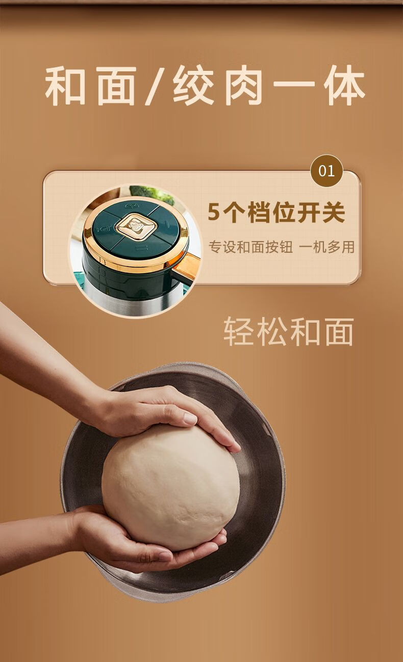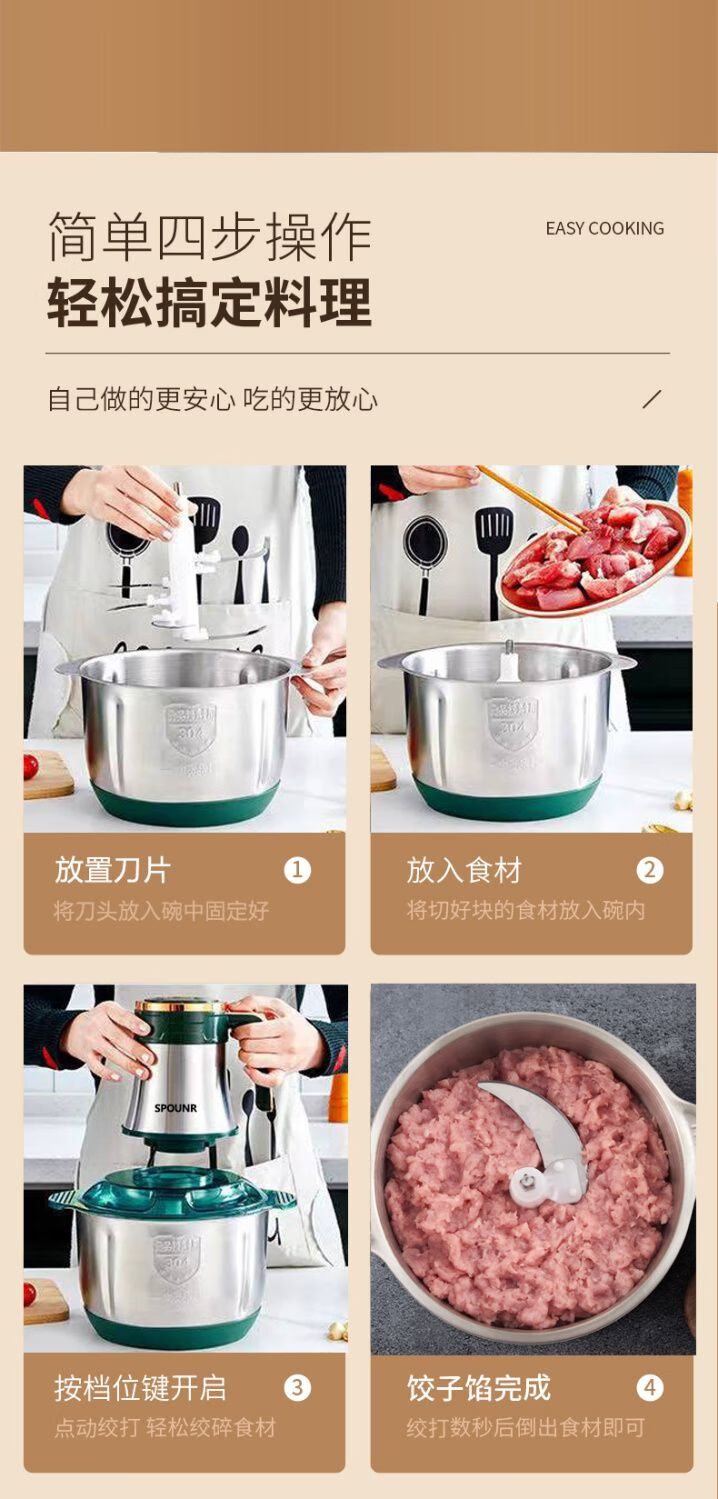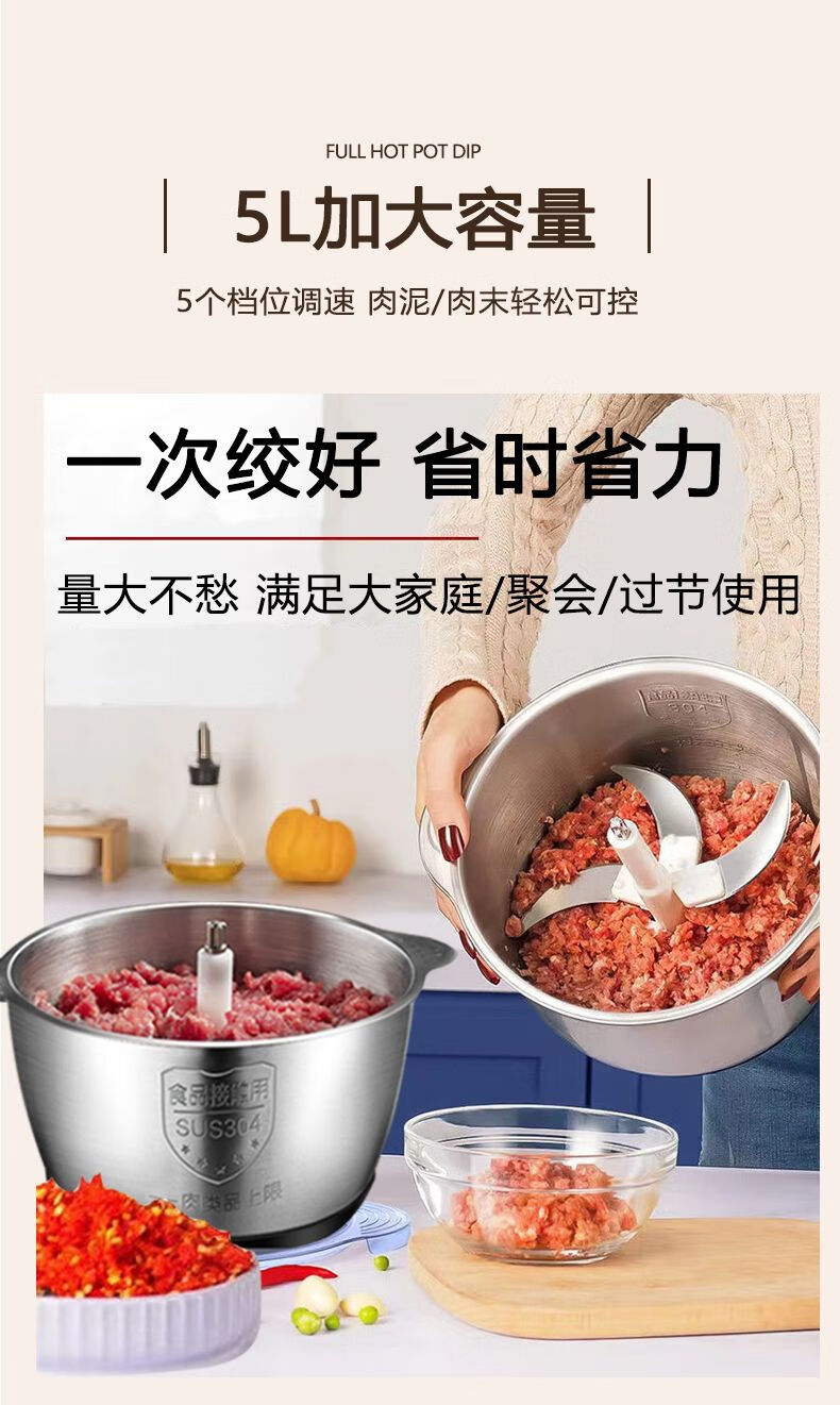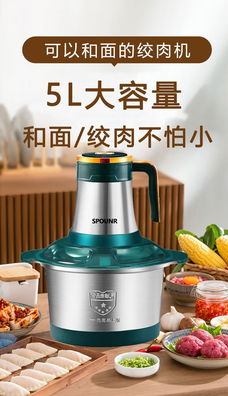 SPOUNR正品苏泊5升家用和面绞肉机不锈钢绞菜馅辣椒多功能料理机碎肉机 5L 3档纯铜电机2套六叶刀500W