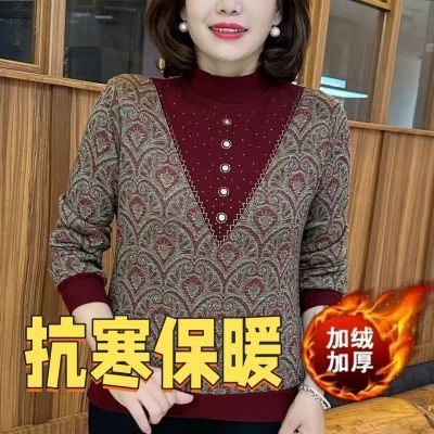 秋冬圆领新款印花长袖女装时尚百搭显瘦烫钻上衣气质减龄妈妈装